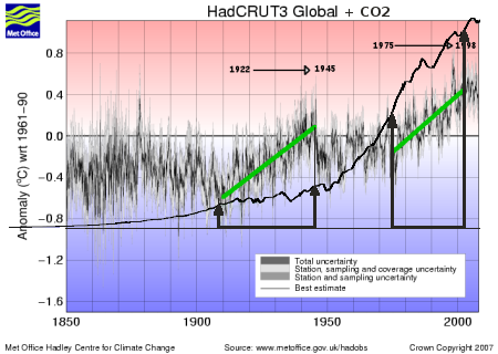 Es una composición. La temperatura global 1850 - 2009 según el Met Office británico, con las emisiones de CO2 sobreimpuestas, haciendo corresponder los años de las temperaturas y del CO2. Veréis dos subidas pronunciadas el siglo pasado (señaladas con líneas verdes). Sorprendentemente comparables en tamaño e inclinación, y sorprendentemente desiguales en emisiones de CO2 (las flechas negras).