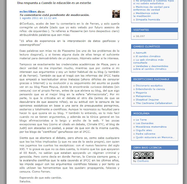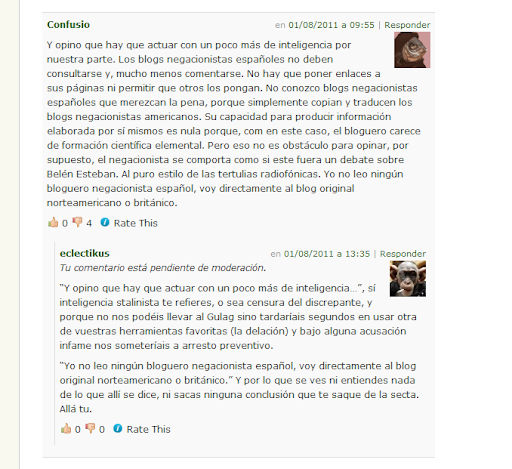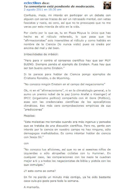 El gachó habla de este blog y lo enlaza, para ponerlo como ejemplo de los horrores de mundo. Pero Ferrán P. Vilar, émulo de Pajín, opina que el derecho de palabra, y de respuesta, no es algo universal - simplemente atenido a unas normas -, sino que depende de la opinión. O más bien del "ser". Si eres esto (bueno) puedes hablar; y si eres esto otro (malo) no puedes hablar. Por eso se monta ese larguísimo rollo para justificar que no se puede hablar con "la negacionía". Se refiere a los que llama, de una forma tan canalla como imbécil, "negacionistas". Pero no penséis que los define, no. Sería una lata, porque las cosas que dice que hacen los negacionistas, son las cosas que él hace. Así que nada de definiciones. Basta con ser de los nuestros para saber quién es "negacionista". ¿No os suena? ¿No os están cantando en la orejas, Leire, ZP, y el resto de los cejas? Y eso ahora, porque a lo que os sonaría hace unos años sería a Franco y a sus mariachis, que sabían muy bien quien era un rojo, un maricón, o un liberal, sin necesidad de definirlos. Pero en ambos casos siempre bien prestos a apartar de la arena pública al culpable de opinión. Su vida es imponer el pensamiento los demás, y censurar al discrepante. Y evitar el debate racional para reducir todo a ¡es un facha! ¡, ¡es un negacionista!, ¡es un neoliberal! ¿Por qué será que tanto la religión, como el socialismo, como el fascismo, como el nacionalismo, como el ecologismo, y como el alarmismo del clima, se reducen a un cuento de buenos y malos? Yo creo que hay una sola respuesta: no pueden soportar la razón. Y quien no soporta la razón, no puede soportar ni el debate, ni la libertad, ni el imperio de las formas y definiciones - de la universalidad de la norma. En realidad no pueden soportar aquello que, mal que bien, ha construido eso que vagamente llamamos Europa, o cultura occidental, mundo moderno, o como le queramos llamar. Por eso lo odian. Por eso no cejan de intentar cambiarlo, y arrastrarnos a una nueva edad media de frailes, , sectas y herejes en la hoguera. No queda más remedio que ponerles el espejo. Gracias a Eclectikus y a Juancho por ello. Recomiendo especialmente, para los que tengan paciencia y gusto por las discusiones, los comentarios que cuelgan en última entrega de los rebuznos del cafre irredento: Y pongo toma de pantalla de los dos últimos comentarios que no pasan la censura. Los demás no hacen falta, porque siguen alli. Y ya digo que merecen la pena como buen estudio de esa tropa. Hay de todo. Desde el que sabe la afiliación política de Ecléctikus, y de ello deduce que está a punto de ponerse a matar jóvenes estilo Noruega, muy aplaudido por el cafre, hasta el cafre mismo negando la esencia del juego limpio: dale a la pelota, no al jugador. Mas un chiflado fantasmón que pasaba por allí, y que no sabe ni cómo se llama. --Las tomas. El sr. Ciencia, o sr. Reglas, tiene una idea curiosa de las reglas. Cuando se le pone te echa, y cuando se le pone deja o no deja pasar tu comentario, al gusto. Al gusto de él, quiero decir, que es lo que llama “reglas”. Por ejemplo, este no le gustaba, y falta: