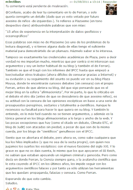 Tampoco se exactamente las credenciales académicas de Plaza, pero a decir verdad no me importan mucho, mientras que por contra si mi interesan sus argumentos y soy un lector habitual de su blog (y también el de Ferran). También se que el tragó con los informes del IPCC hasta que empezó a leer/estudiar otros trabajos (ahora difíciles de censurar gracias a Internet) y su evolución y su magistral seguimiento del asunto se puede ver en su blog Plaza Moyua, donde te encontrarás curiosos debates (sin censura) con el propio Ferran, antes de que abriera su blog, del que sigo pensando que es el mejor en la esfera “afirmacionista”, Por mi parte, lo que le criticaba en el debate el otro día (antes de que se descubriera de que asesino niños), es su actitud con la censura de las opiniones escépticas en base a una serie de presupuestos peregrinos, sectarios y totalmente a-científicos. Aunque le reconozco su facultad para hacer lo que quiera en su blog. Y también lo entiendo, es lo más facil cuando no se tienen argumentos, y además es la tónica general en los blogs afirmacionistas a lo largo y ancho de la web. Y las pocas excepciones que hay (como el citado en debate, Climate ETC, el blog de Judit) son atacadas sin piedad, a pesar de que son de la misma cuerda, por los blogs de “científicos” genuflexos con el IPCC.