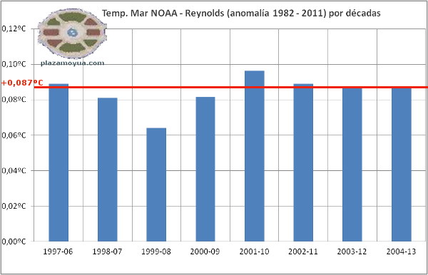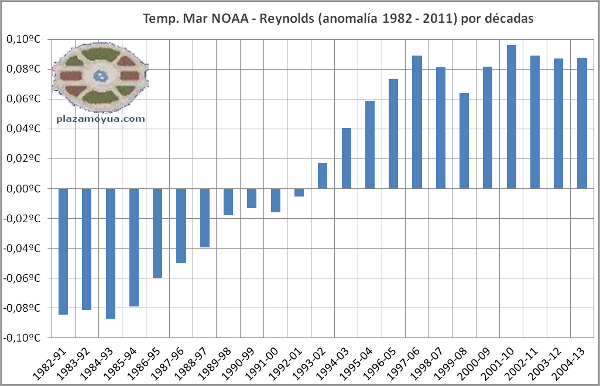 NOAA / Reynolds en períodos de diez años. En “anomalías”, esta vez la diferencia con la media 1982 - 2011 (suelen usar un período de 30 años para definir “clima”).