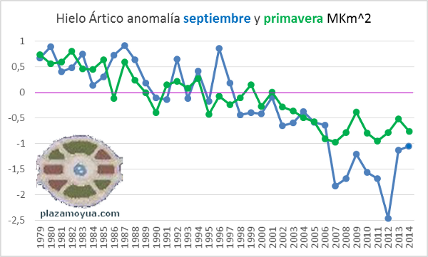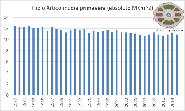 Lleva como once años sin disminuir el de primavera (verde). Y sobre todo, esas cifras e imágenes espectaculares que suelen sacar sobre la “espiral de muerte” del hielo del Ártico son todas de final de verano (azul).